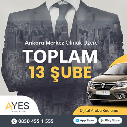 Ankara’da kiralık araba ihtiyacınız için araç kiralamak oldukça kolay. Ayes Rent a car olarak kurumsallaşmayı ve gelişmeyi kendimize ilke edinmiş, bu yolda memnuniyetle hizmet verdiğimiz müşterilerimizle birlikte uzun yıllar kat etmiş bulunmaktayız. Ankara oto kiralama firmamız; merkez şubesi Ankara’da olmak üzere Türkiye genelinde toplum 13 şubeden oluşmaktadır.